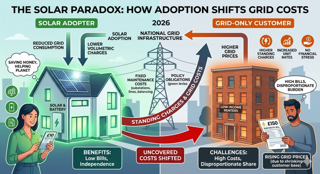 The Solar Paradox illustrates a fundamental transformation: the grid is transitioning from merely being a commodity provider (selling electrons) to functioning as an insurance policy (ensuring access when individual systems fail). However, our current billing systems remain anchored in the "commodity" era.